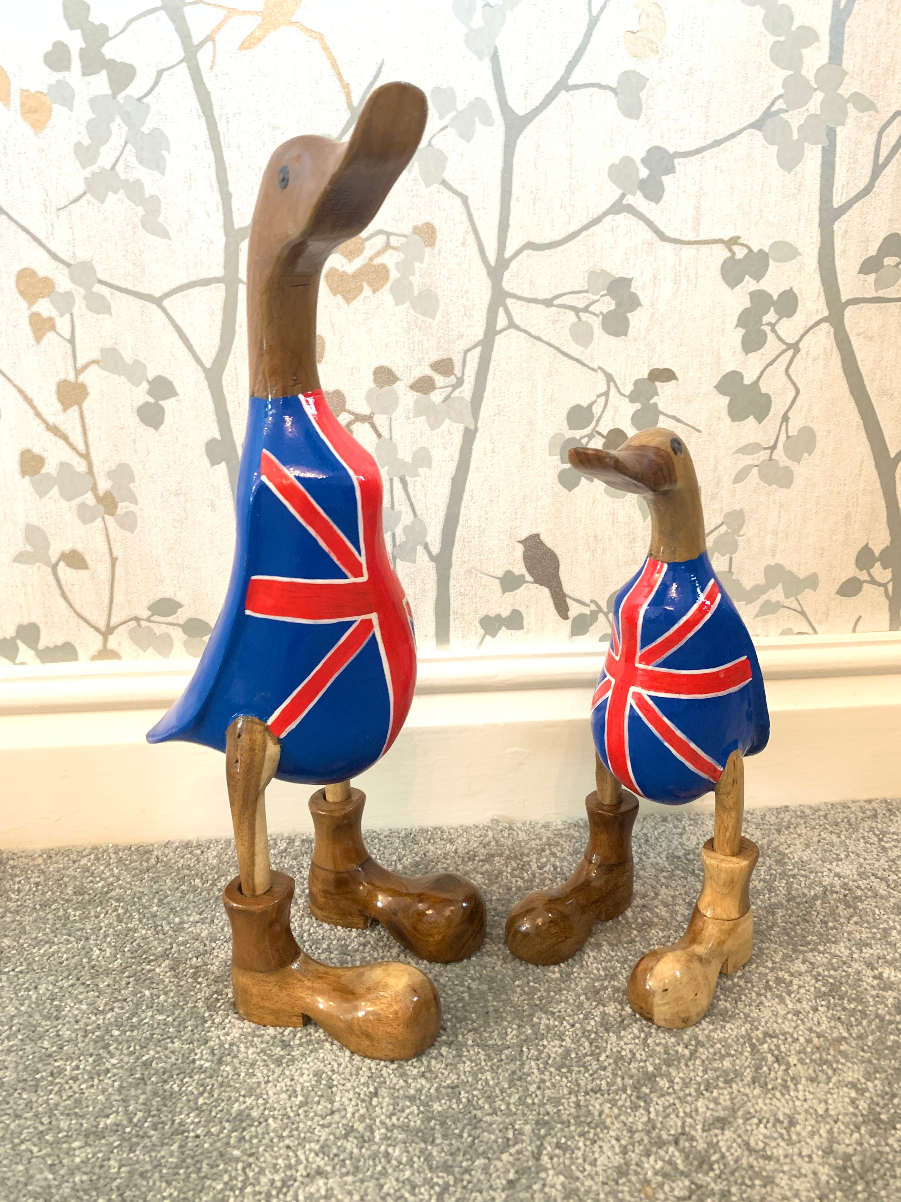 These cute British flag ducks with welly boots are hand-painted and hand carved by our skilled artisans in Indonesia .