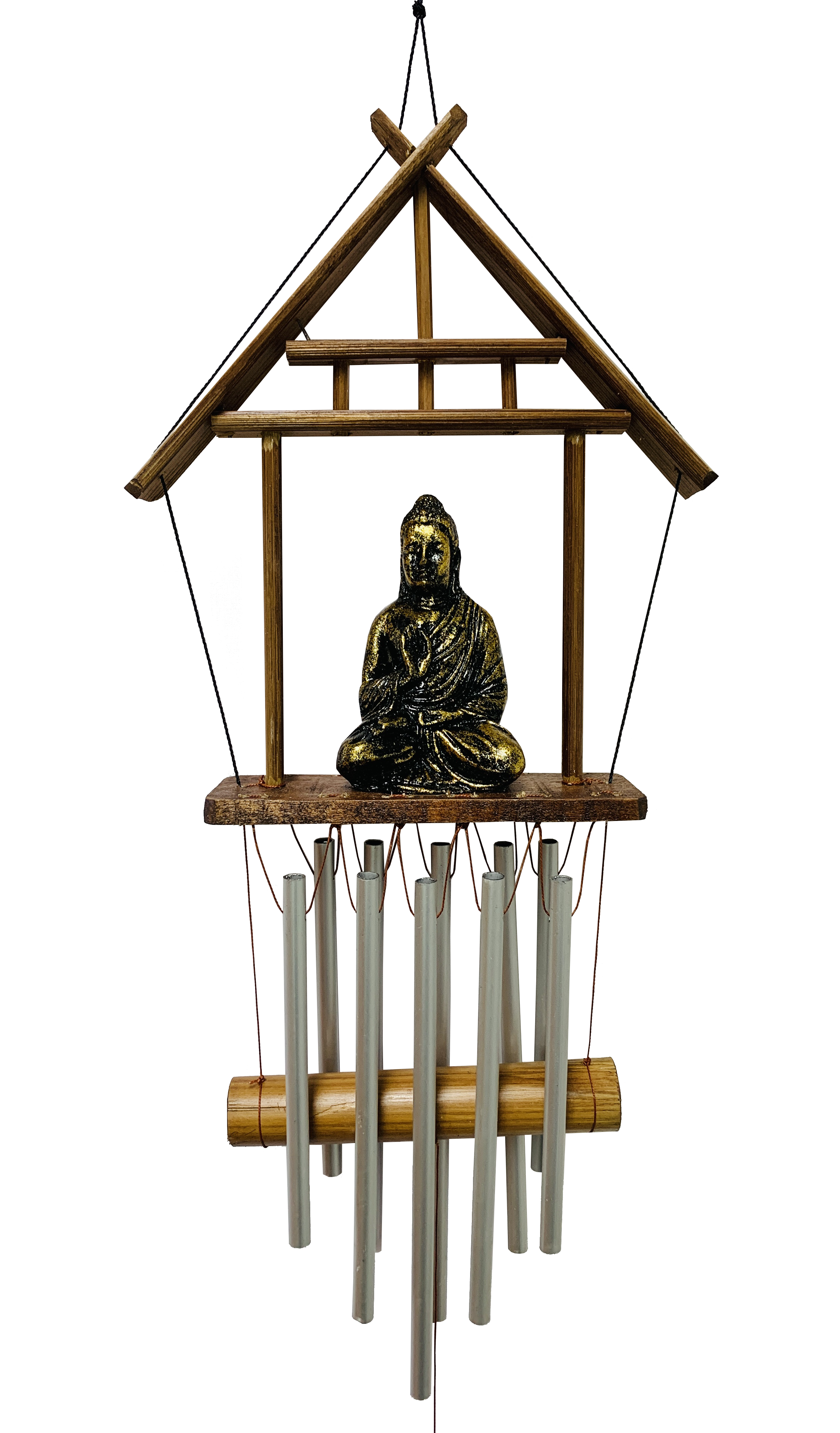 This bamboo wind chime features a serene Buddha sitting in a bamboo temple. Iron chimes under the chime will tinkle gently in the breeze to make a lovely gentle relaxing sound in your garden. All hand made by families we work with in Indonesia and 100% fair trade.