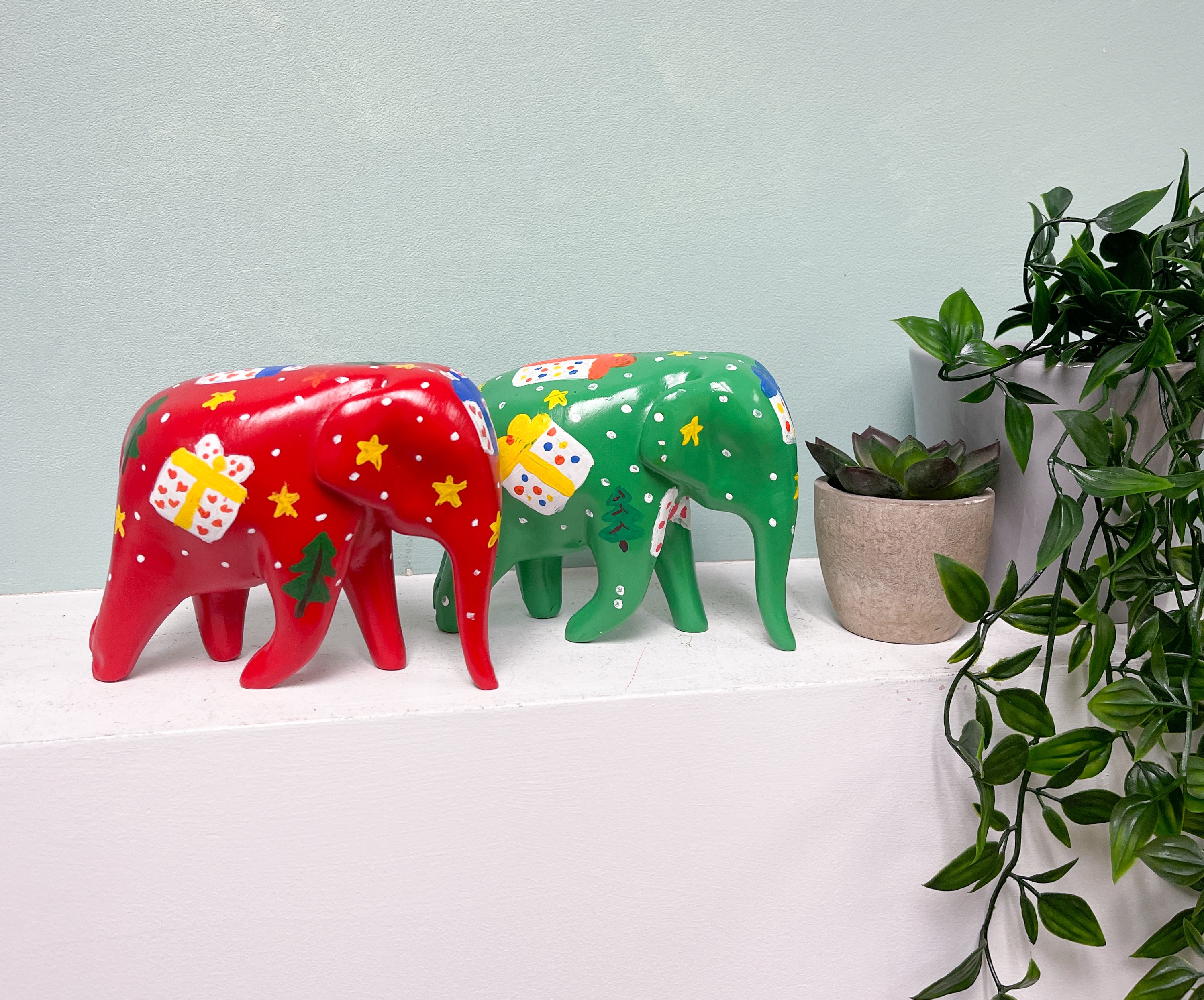 These fabulous Christmas elephant ornaments are handmade with resin by our skilled artisans in Thailand. They come in a choice of 4 colours but as they are hand painted the colours of the design may vary slightly to the photo - this makes your elephant completely unique!Please note, this listing is for one elephant only. Photo is to show difference in colours.Dimensions:Height - 10cmWidth - 13cmDepth - 7cmFair Trade is a simple way to make...