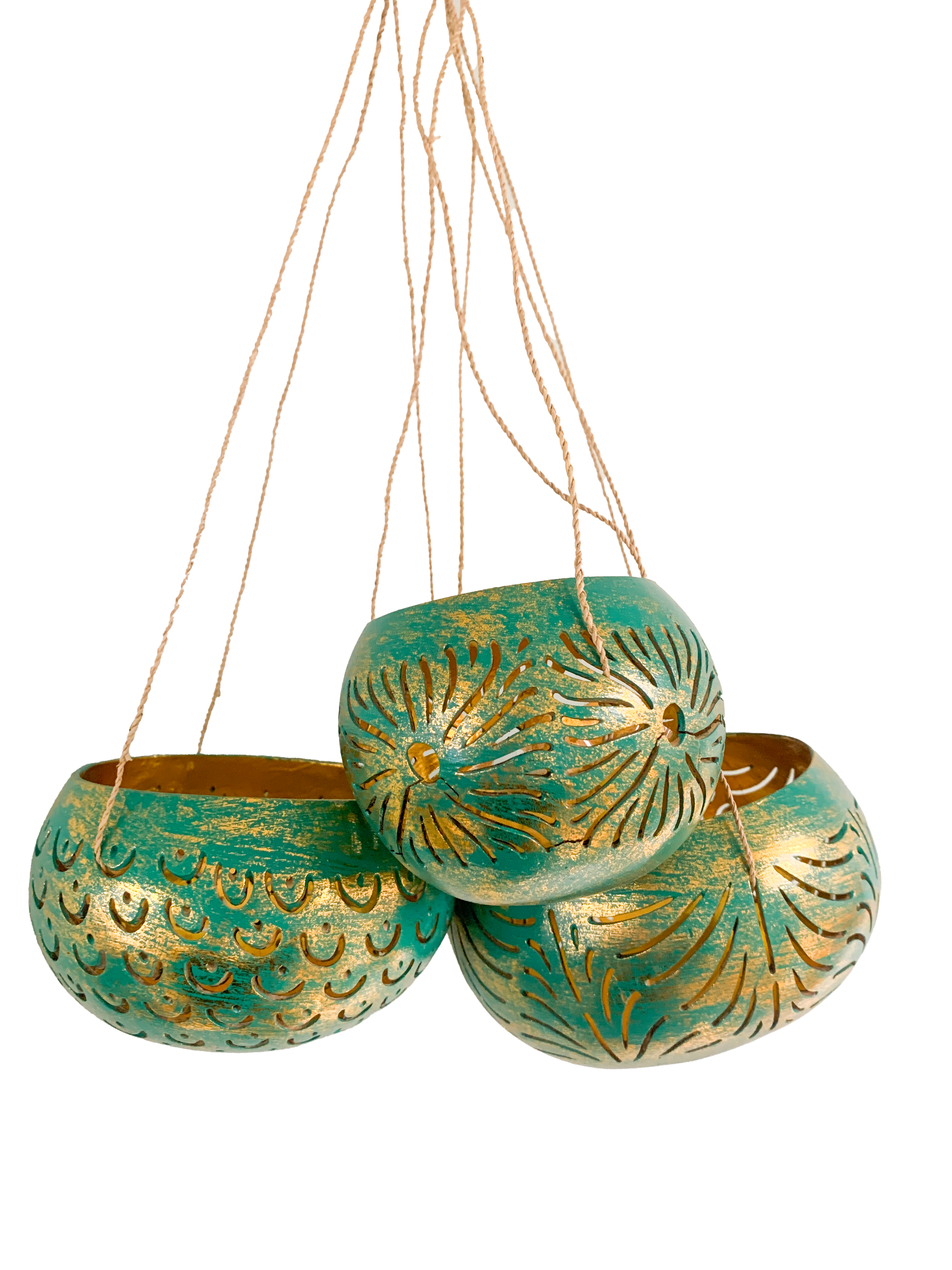 Transform your home into a serene oasis with our eco-friendly Coconut Candle Holders. Handcrafted from reclaimed coconut shells, our candle holder promotes sustainability while adding a tropical touch to your environment. Painted inside with a wonderful warming gold that maximises light reflection.Alternatively, why not use these beautiful, ornate shells as hanging planters. Measures (approx):Small 12 x 12 x 8cmMedium 13 x 13 x 9cmLarge 15 x 15 x 10cm(As these are made from natural coconut...