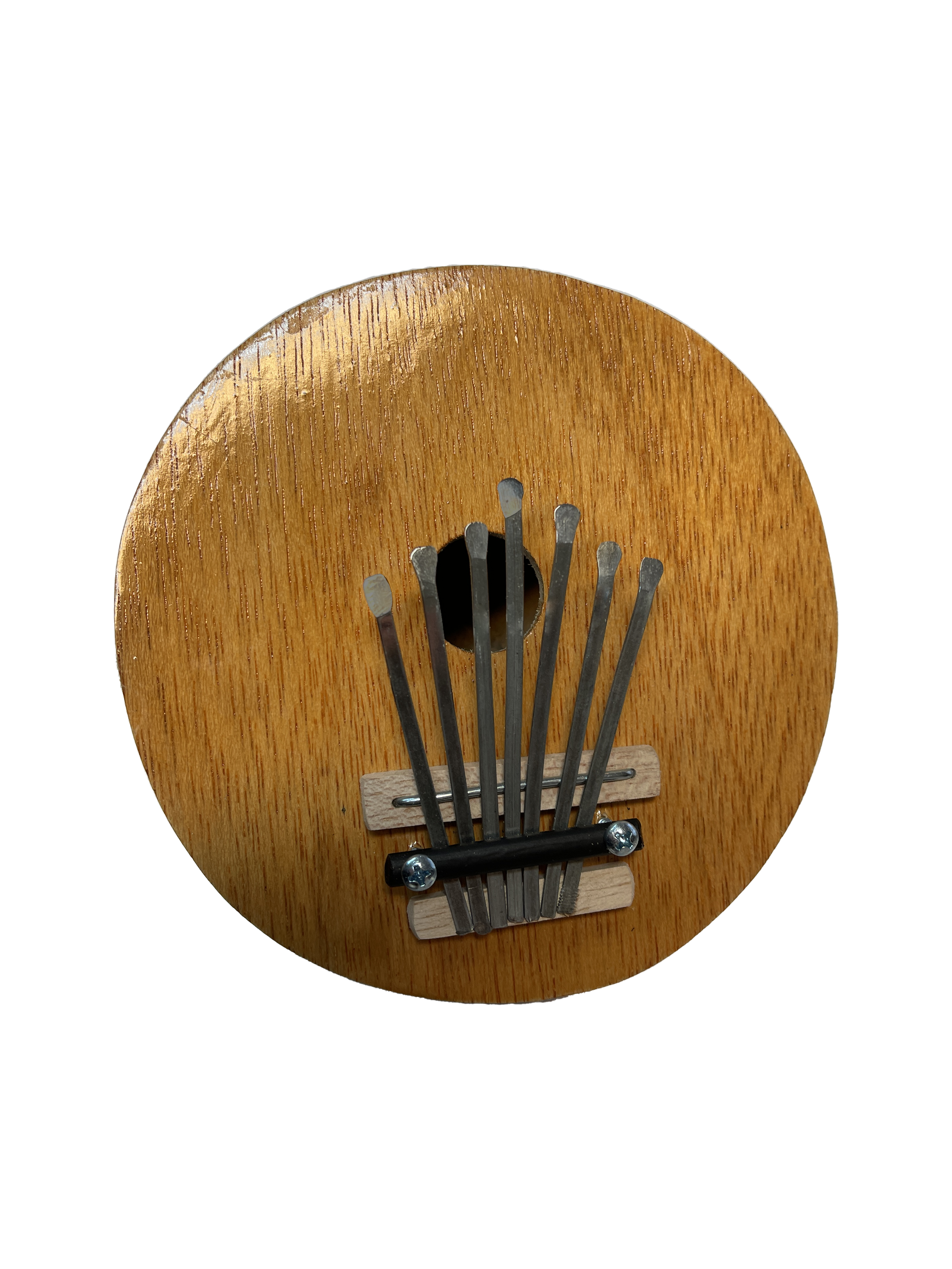This beautiful thumb piano has been placed over a polished half coconut. This creates a resonating chamber that produces a louder, more harmonically complex sound. These thumb pianos measure approx 15cm.