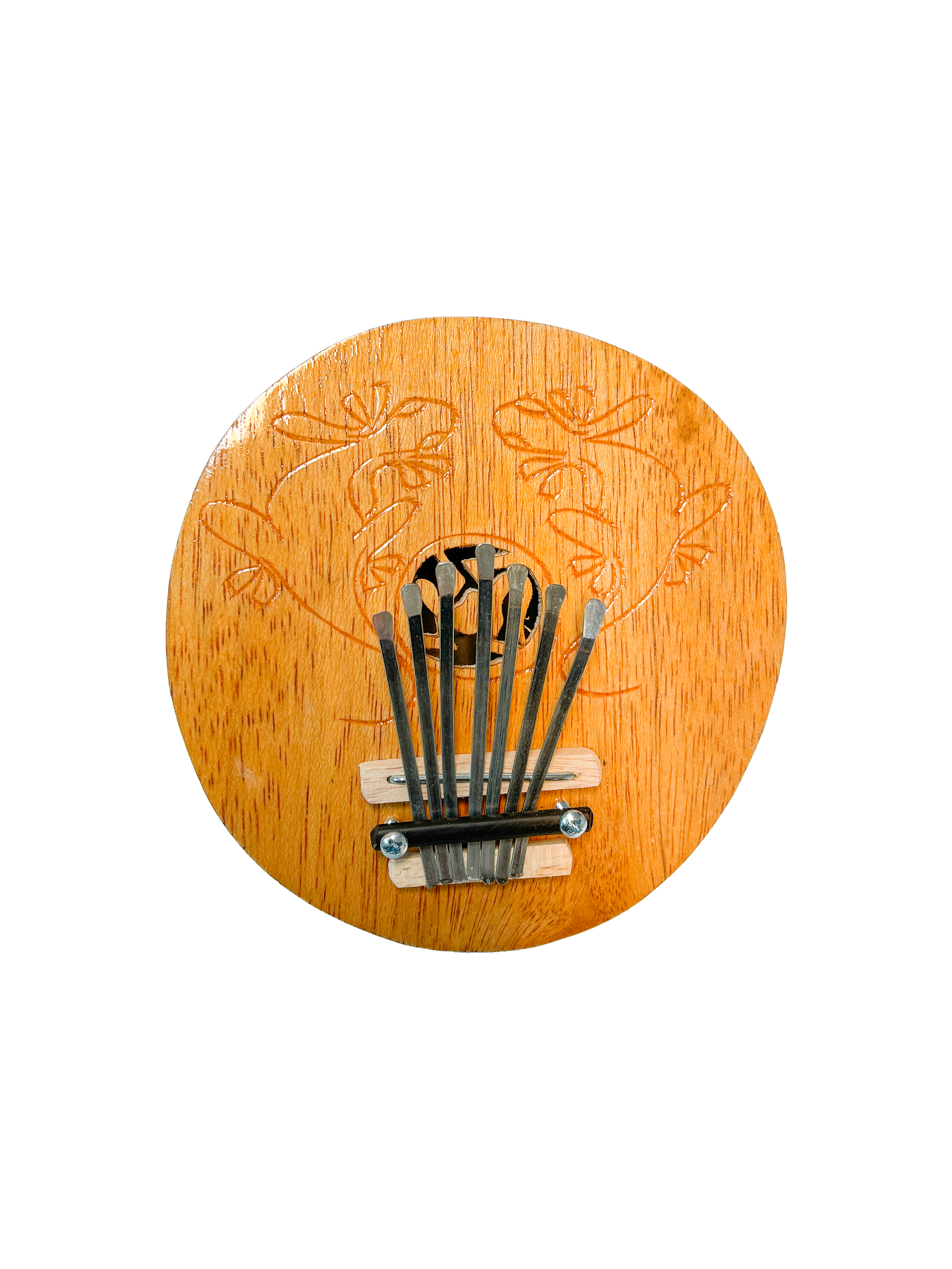 This beautiful thumb piano has been placed over a polished half coconut. This creates a resonating chamber that produces a louder, more harmonically complex sound. The top has been carved with a ghekko design.These thumb pianos measure approx 20cm.