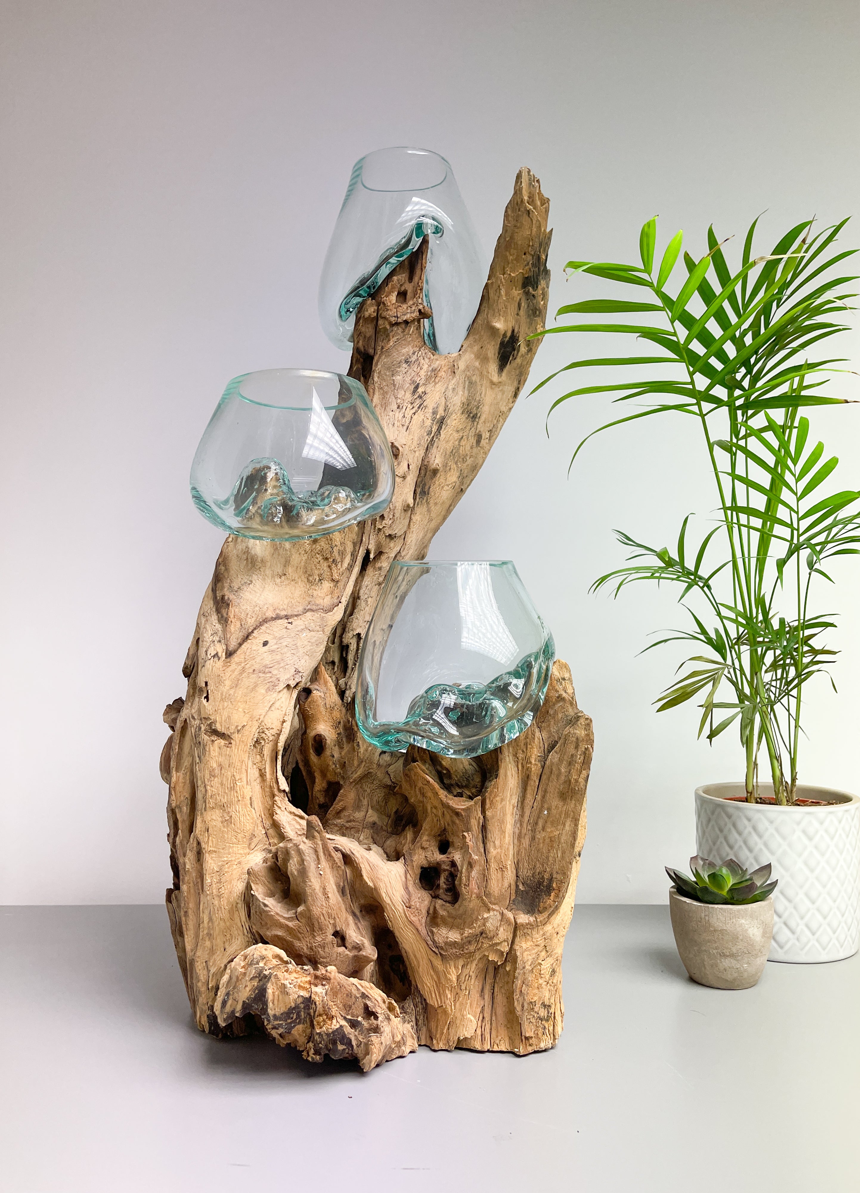 These glass bowls are made from recycled glass that is hand blown onto individual pieces of wood creating a truly unique item! We work directly with the families that make these products so they are completely Fair Trade too.