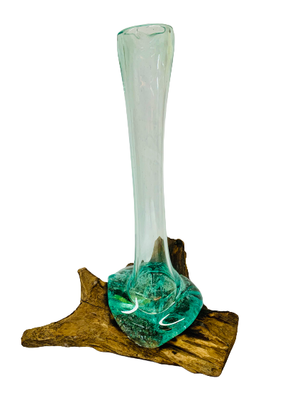 These glass vases are made from recycled glass that is hand blown onto individual pieces of wood creating a truly unique item! We work directly with the families that make these products so they are completely Fair Trade too.