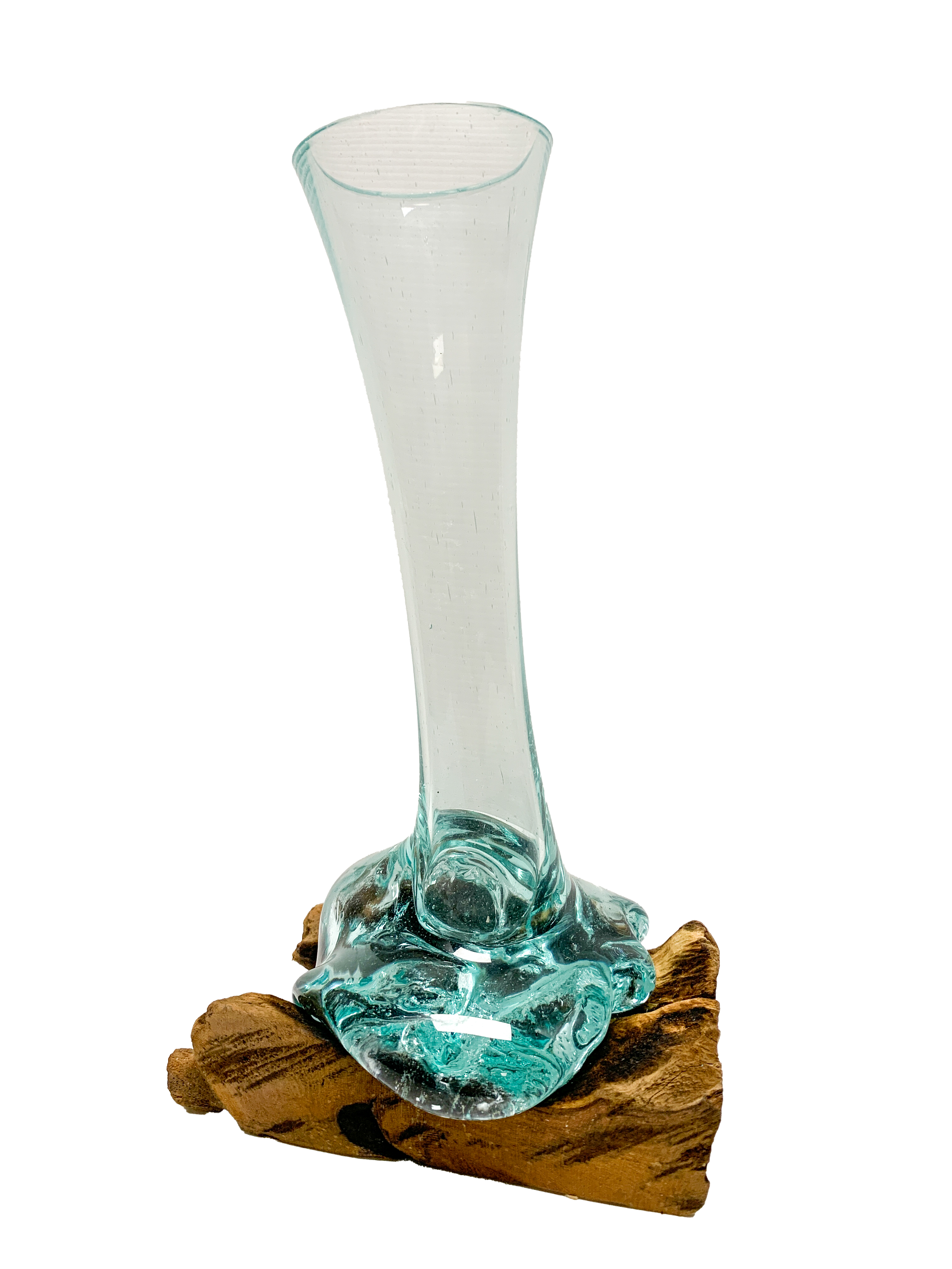 These glass vases are made from recycled glass that is hand blown onto individual pieces of wood creating a truly unique item! We work directly with the families that make these products so they are completely Fair Trade too.