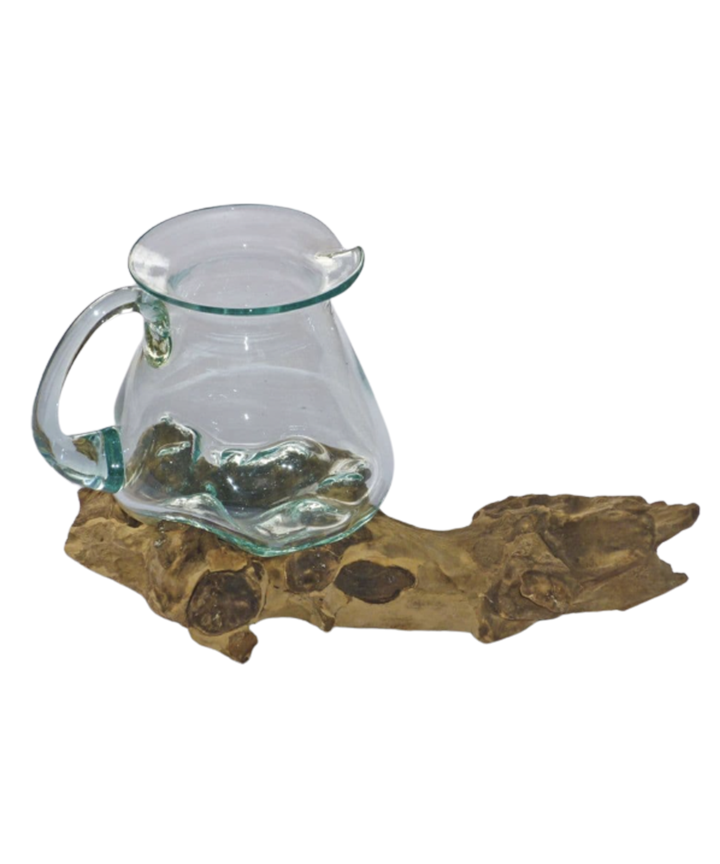 These glass jugs are made from recycled glass that is hand blown onto individual pieces of wood creating a truly unique item! Please note that as each item is completely hand made and each piece of glass is individually melted onto it's own piece of wood that each product is unique. The picture is for representation only and the item you receive will be very similar in size and shape but will be slightly different. You can truly say you have a unique work of art when you own one of these jugs! As the glass is recycled there may be bubbles and slight marks on the glass. These are not flaws. In fact, if you place these jugs in the sun with a bit of water in these jugs almost shimmer! Not suitable for candles as heat may cause the glass to crack.