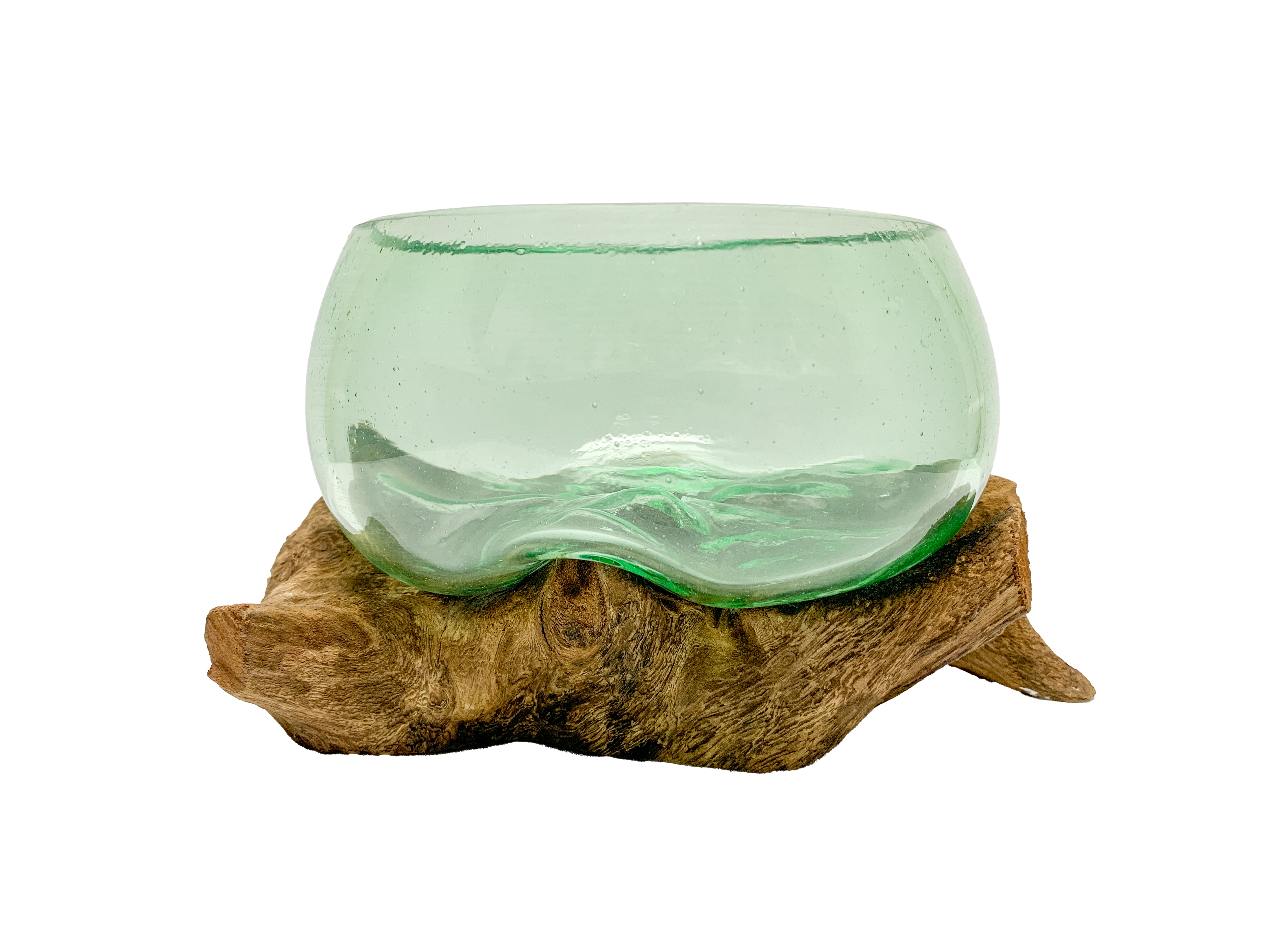 These glass bowls are made from recycled glass that is hand blown onto individual pieces of wood creating a truly unique item! We work directly with the families that make these products so they are completely Fair Trade too. Sizes are approximately:Height - 15cmWidth - 20cmDepth - 12cm