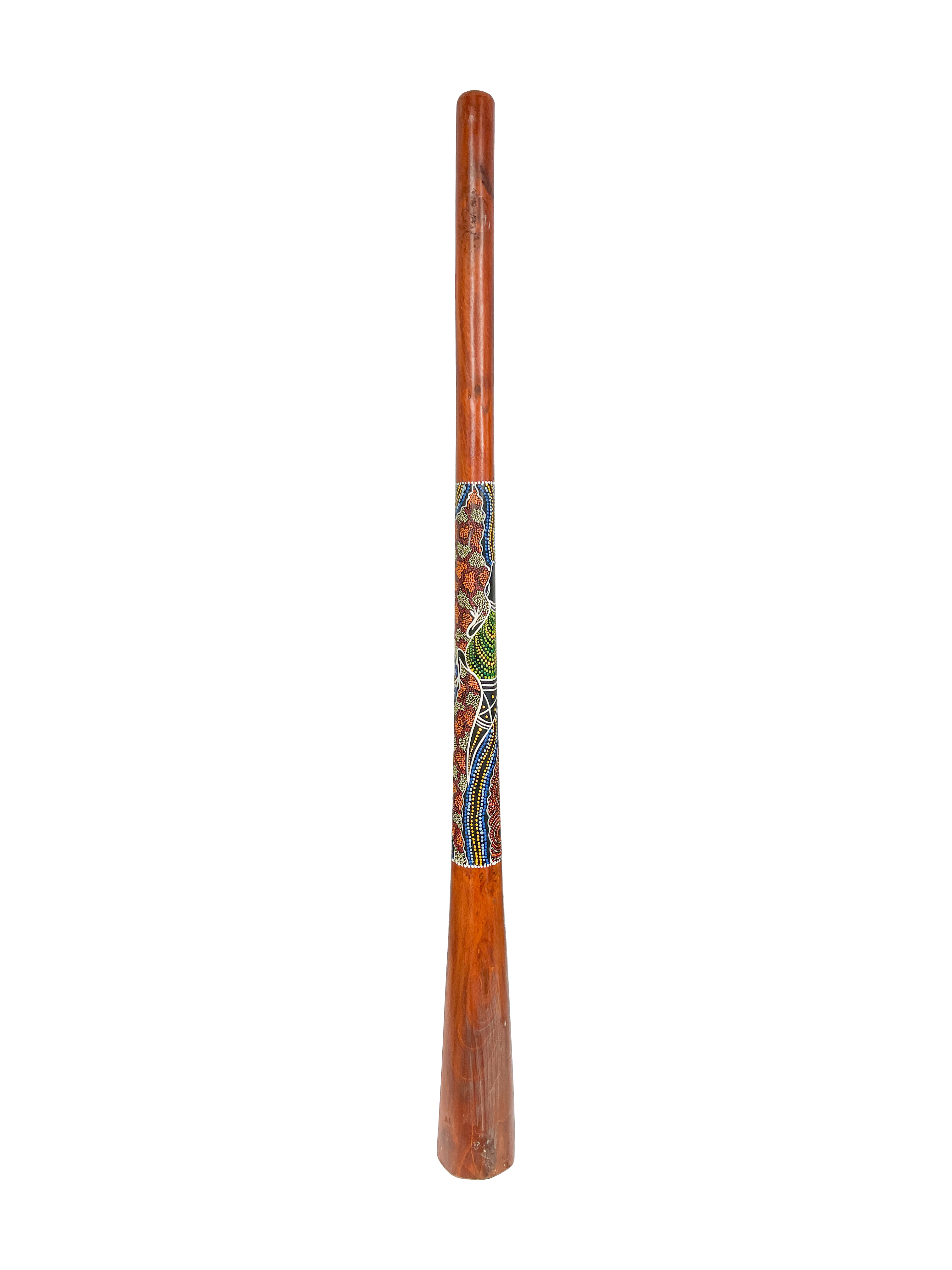 These impressive didgeridoos are all handmade and hand carved from Albesia wood, then hand-painted. Designs draw inspiration from a wide range of influences, including Aboriginal style dot painting techniques. These are hand made and each item is entirely unique and therefore varies slightly due to this. This didgeridoo measures 130cm in length.