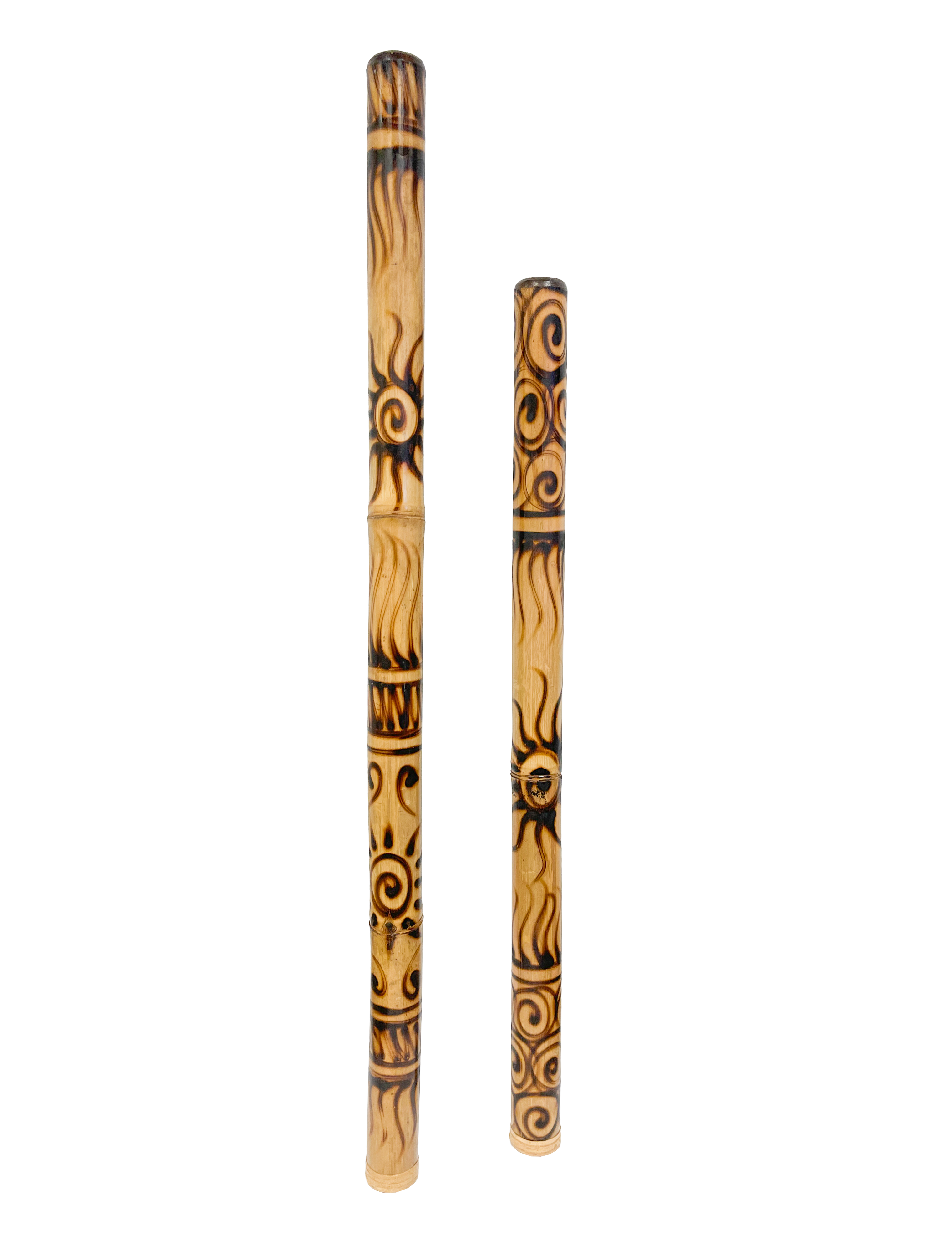 These impressive didgeridoos are made from bamboo and have a burnt sun design on them. They come in 100cm and 120cm.