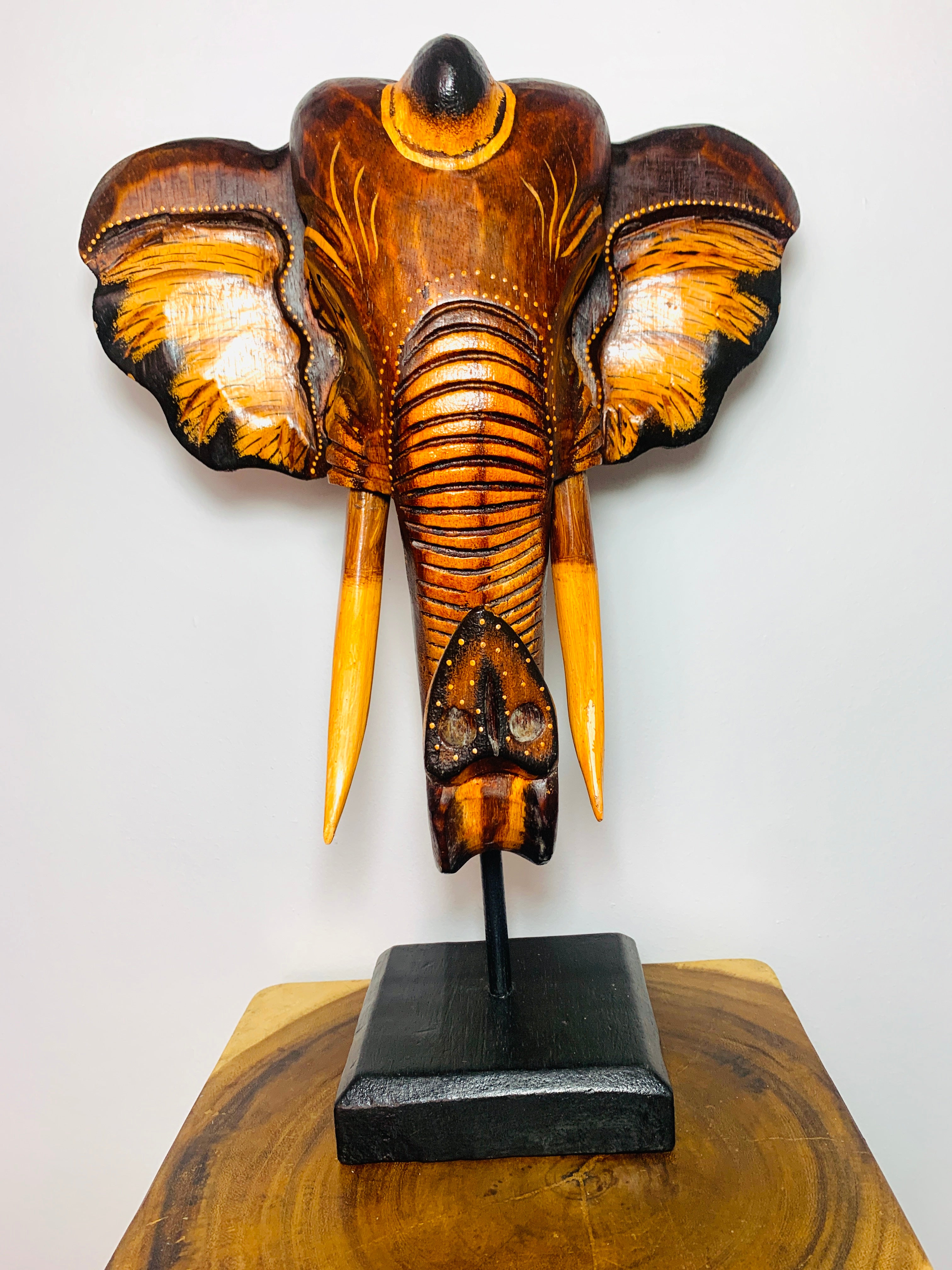 We have a wide selection of wall masks and freestanding animal masks in our shop in a range of colours and shapes, including elephants, zebras, giraffes and gazelles. The masks come a range of sizes. All our masks are made from sustainable Albesia wood.