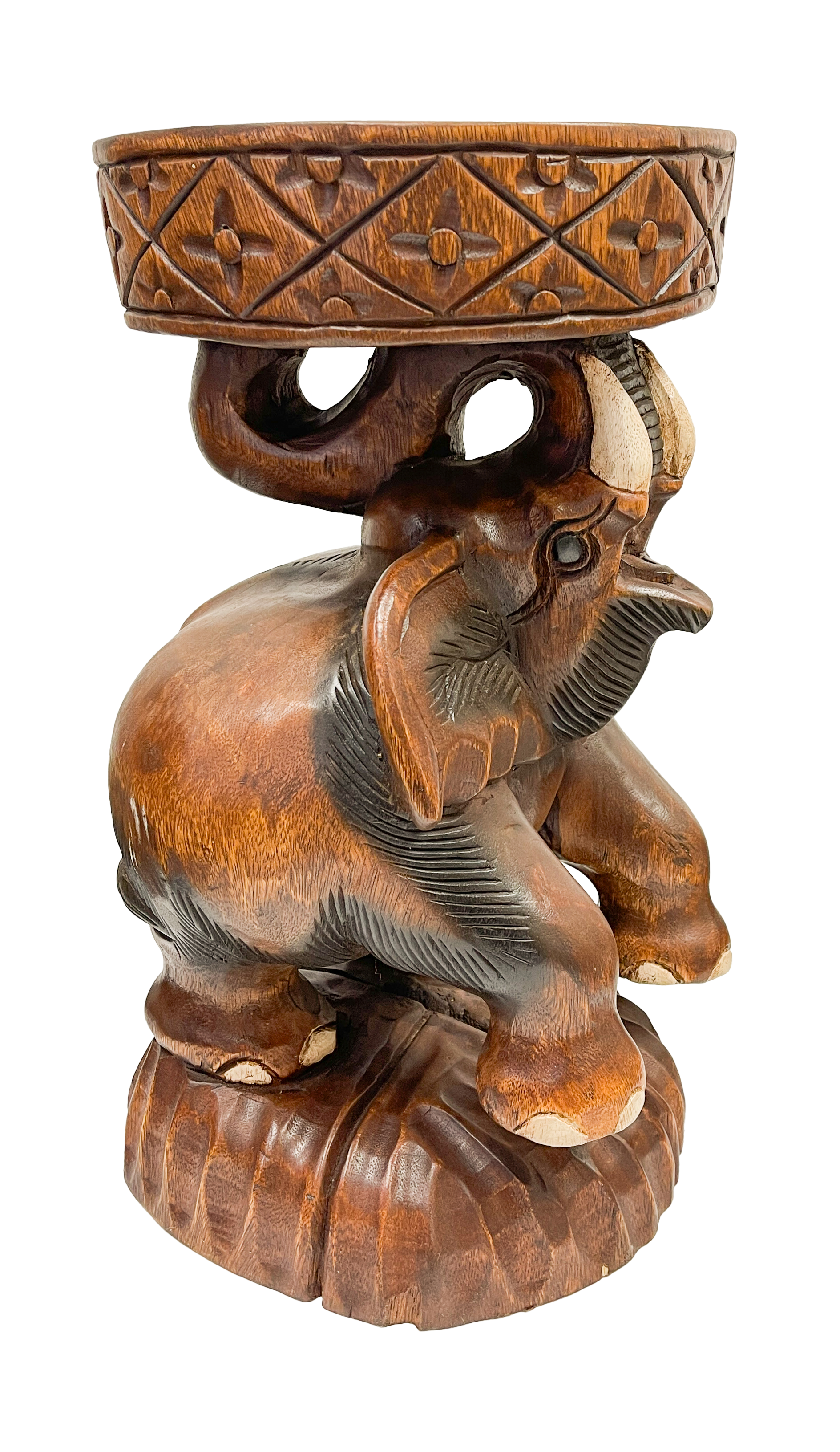This hand carved elephant stool is simply a stunning work of art in it's own right. This elephant has it's trunk up to support a platform and sits steady upon it's four legs. Carved by the families we work with in Thailand and 100% Fair Trade this stool is made from Monkey Pod wood.