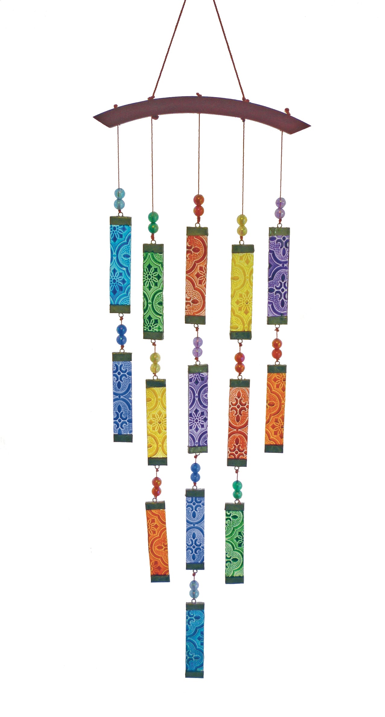This beautiful glass wind chime consists of many pieces of coloured patterned glass hung together to form a stunning waterfall shape chime. Guaranteed to brighten up any room!
