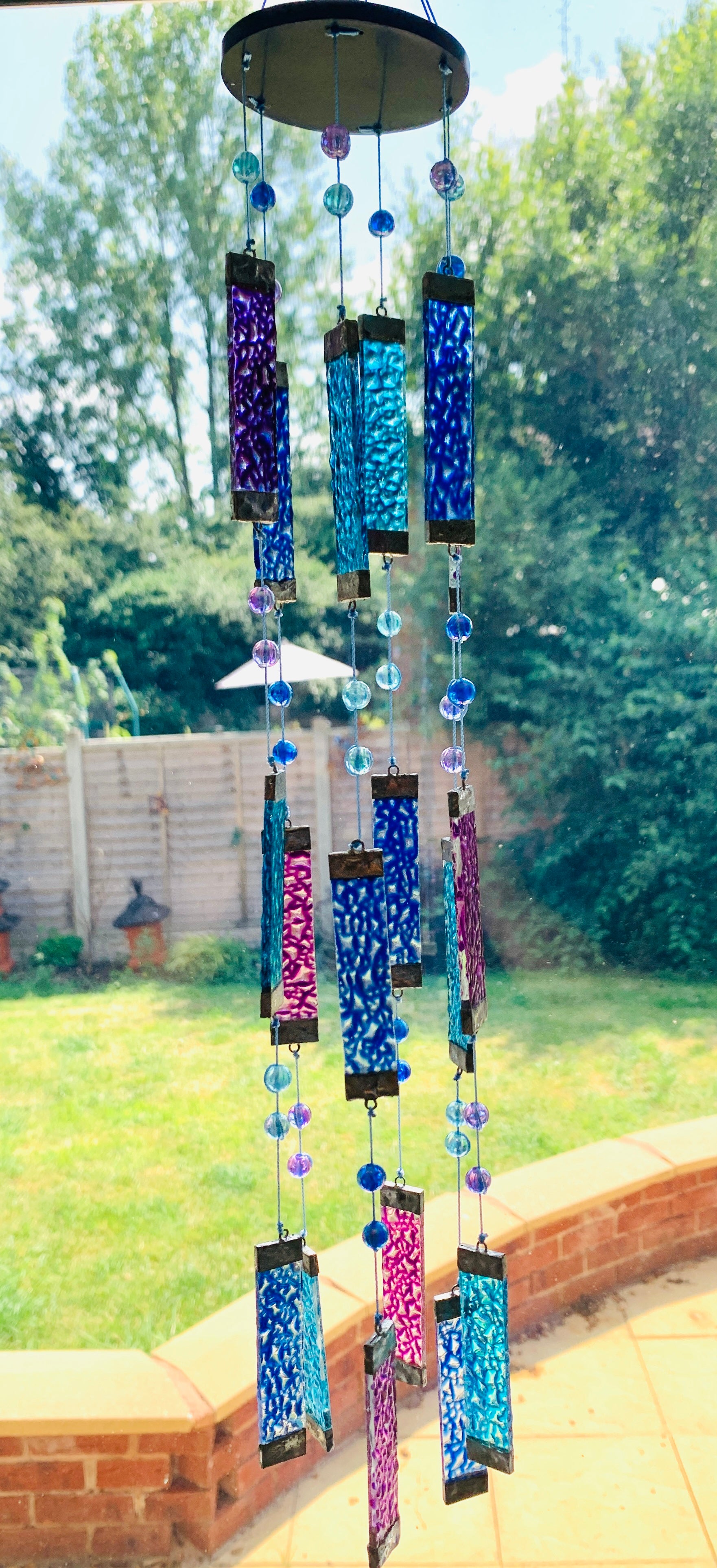 This beautiful glass wind chime consists of many pieces of blue and purple coloured patterned glass hung together with beads to form a stunning chime. Guaranteed to brighten up any room!