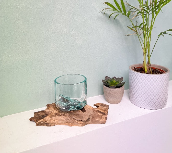 These glass tumblers are made from recycled glass that is hand blown onto individual pieces of wood creating a truly unique item! We work directly with the families that make these products so they are completely Fair Trade too.