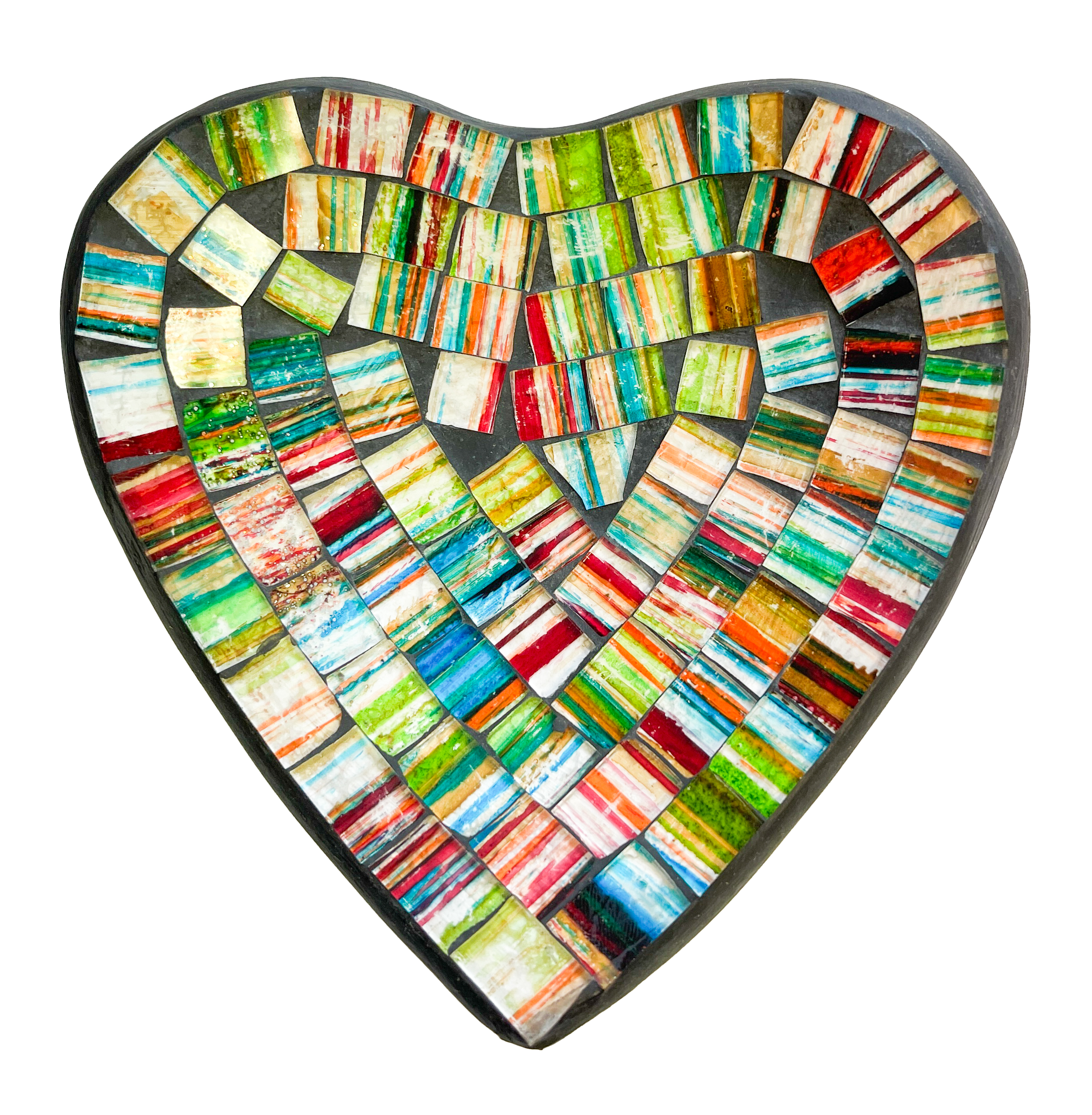 These heart mosaic bowls feature a vibrant design that adds a touch of colour to any space. Made of glass mosaic, each bowl is completely unique as they are handmade. Can be used for decorative purposes, to hold a tea light candle or simply as a cute trinket dish for your bedside table. Dimensions: Width - 12cmHeight - 3cm