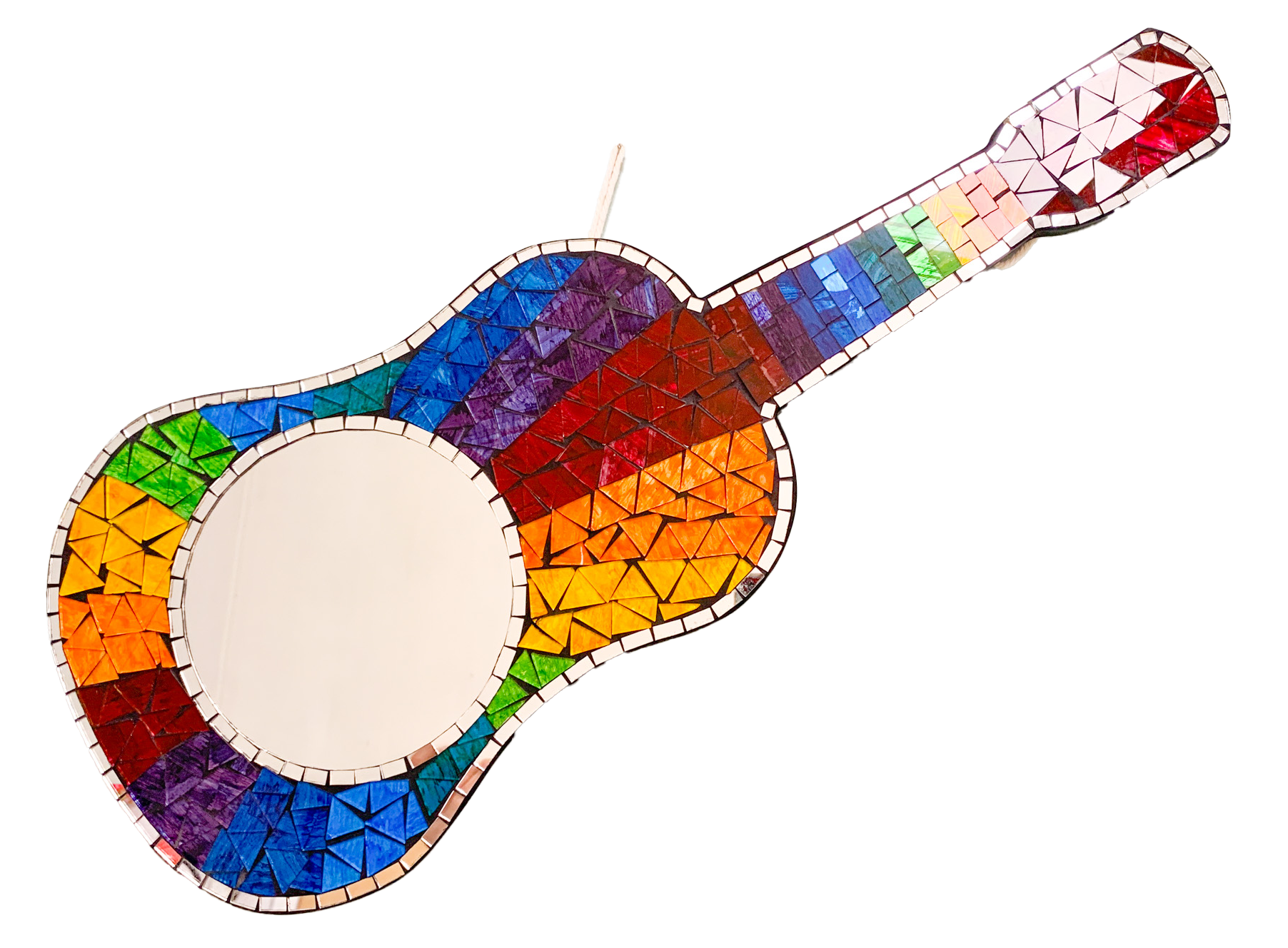 This handmade plaque has been made with rainbow glass and mirror mosaic pieces intricately placed onto a black MDF background to create a sparkling, wall hanging piece of art complete with a mirror too. With two wall hanging mechanisms this can be hung either vertically or in a playing position!