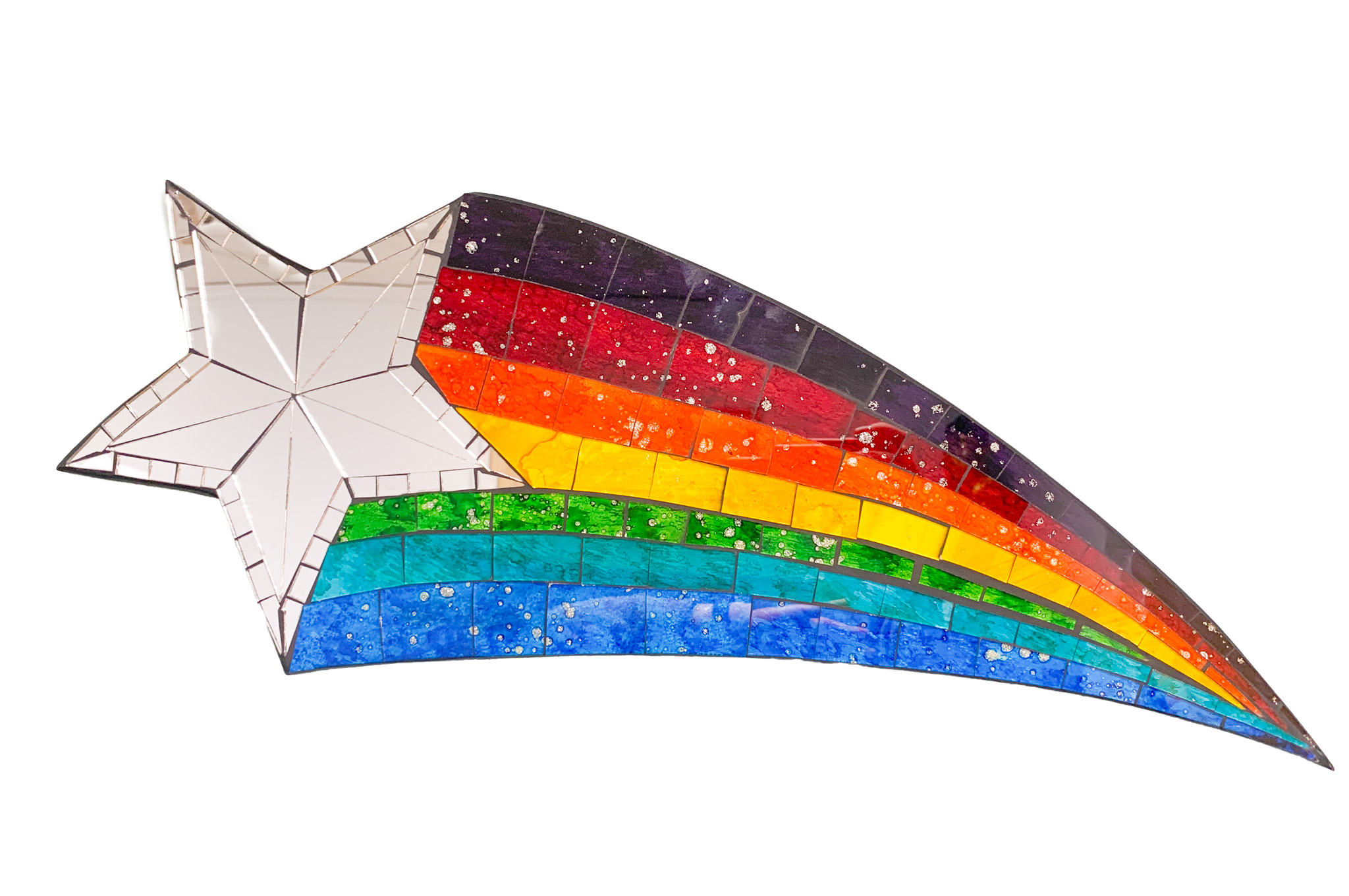 This handmade plaque has been made with rainbow glass and mirror mosaic pieces intricately placed onto a black MDF background to create a sparkling, wall hanging piece of art.