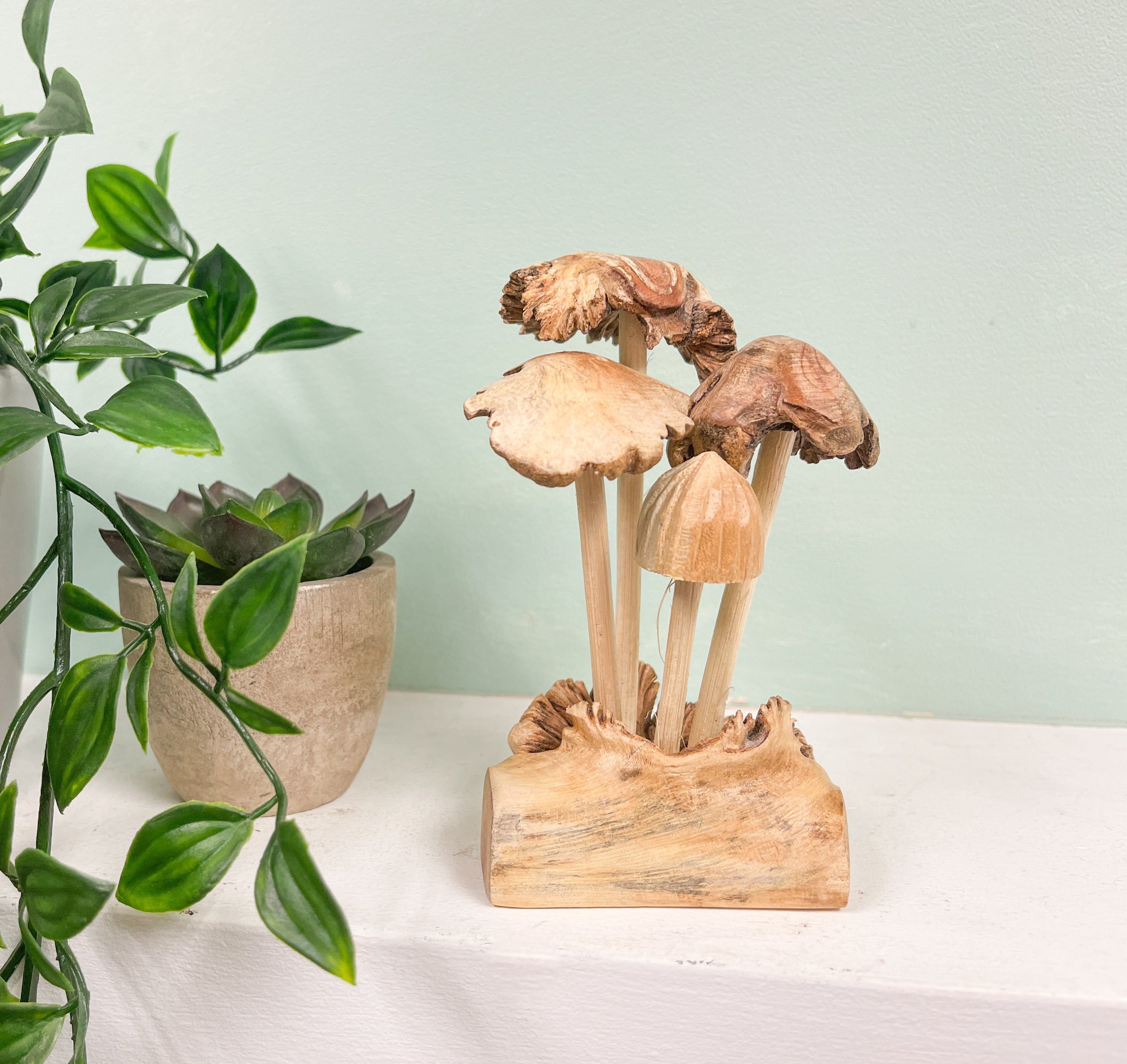 This wood carving is lovingly hand carved by the wonderful artisans we work with in Indonesia. Comprising of four mushrooms.Dimensions (Approx):Width - 7cmHeight - 12cmThe main part of the carving is carved from wood from the Chinaberry tree. The Chinaberry tree, in particular, can play host to a parasitic plant, a little like mistletoe, that attaches itself to the bark of the tree, and takes nourishment from the tree sap. Whilst the parasitic plant is...