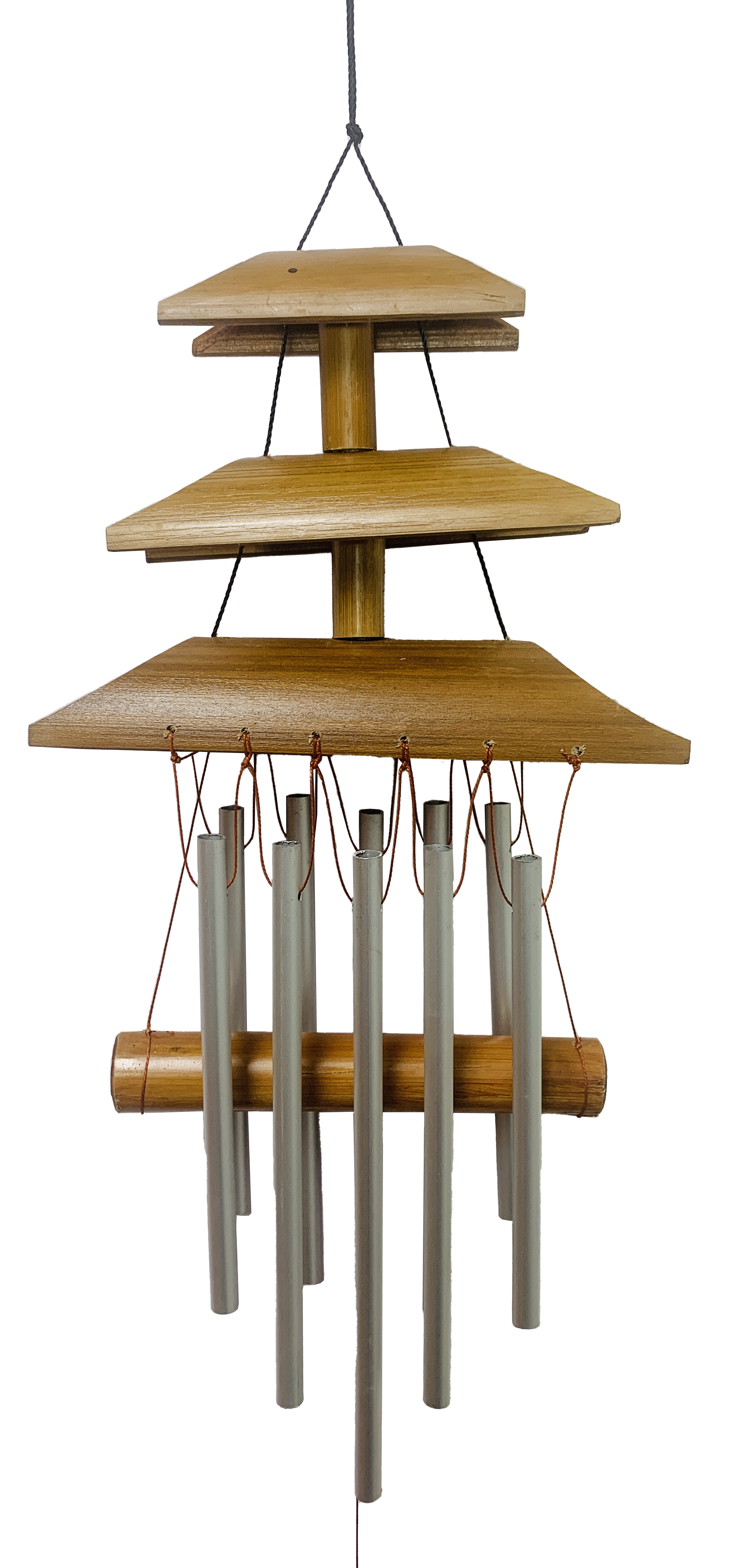 This bamboo wind chime features a serene bamboo temple in natural colours with a pattern burnt on. Iron chimes under the chime will tinkle gently in the breeze to make a lovely gentle relaxing sound in your garden. All hand made by families we work with in Indonesia and 100% fair trade.