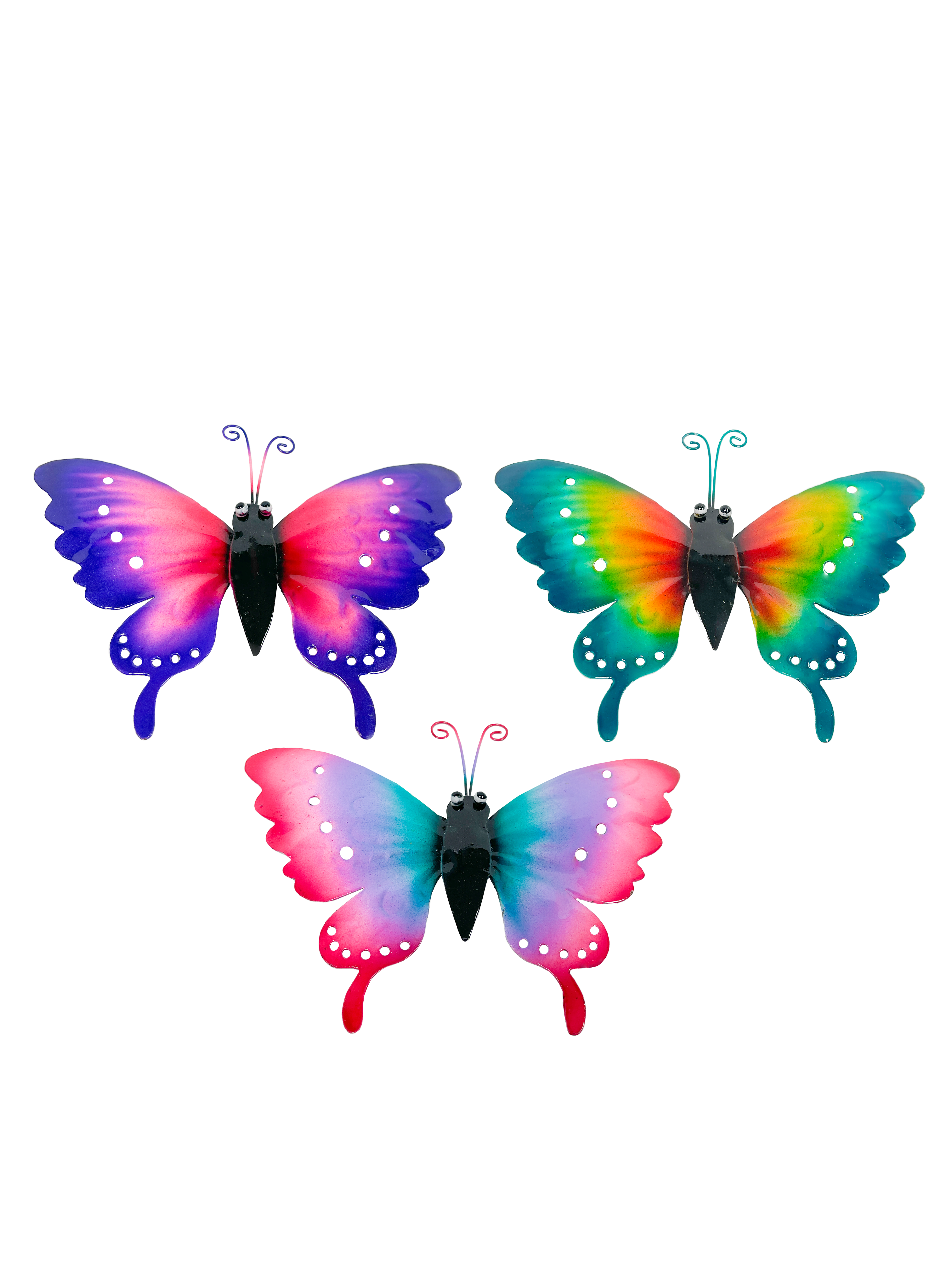 These fun ornaments are made from tin and hand painted by skilled workers in Indonesia. These butterflies come in assorted designs and one will be picked at random. Comes with a hanger on the back to display on a wall or garden fence.