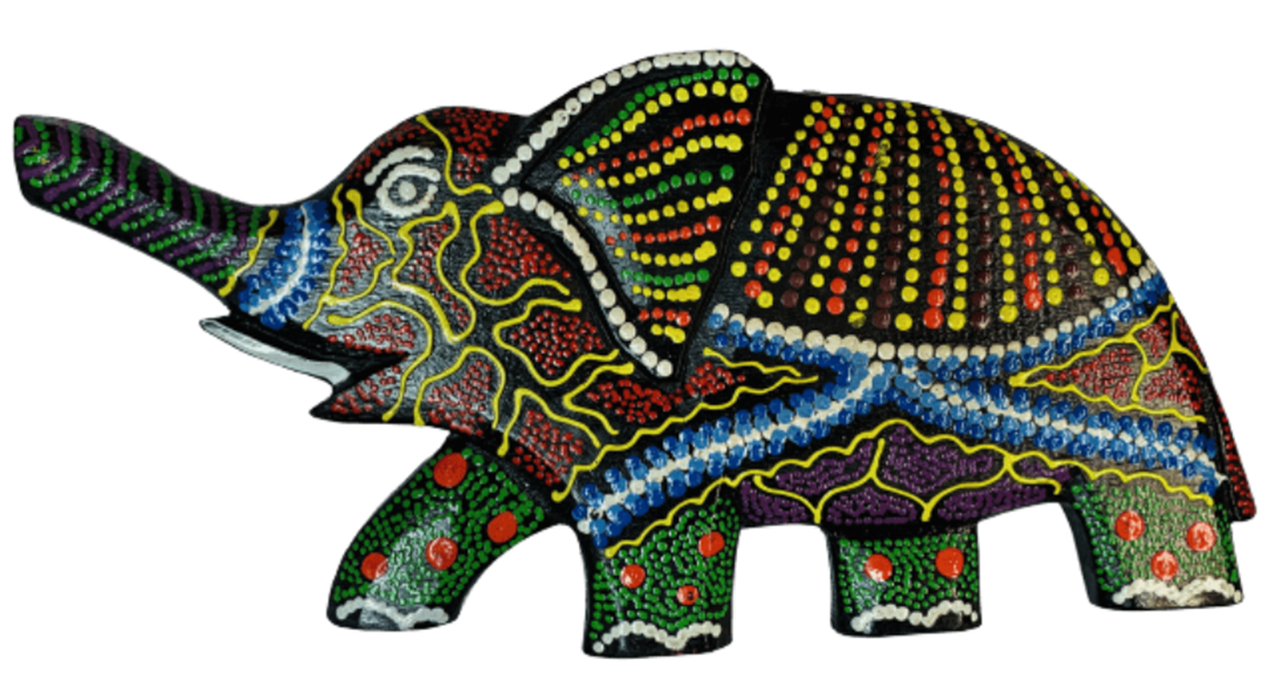 Beautifully hand carved and painted wooden elephant plaque. The trunks up are reputed to bring good luck!