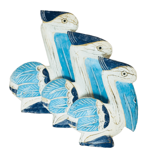 Set of three pelicans, in shades of blue and white. Hand-carved and painted from wood.