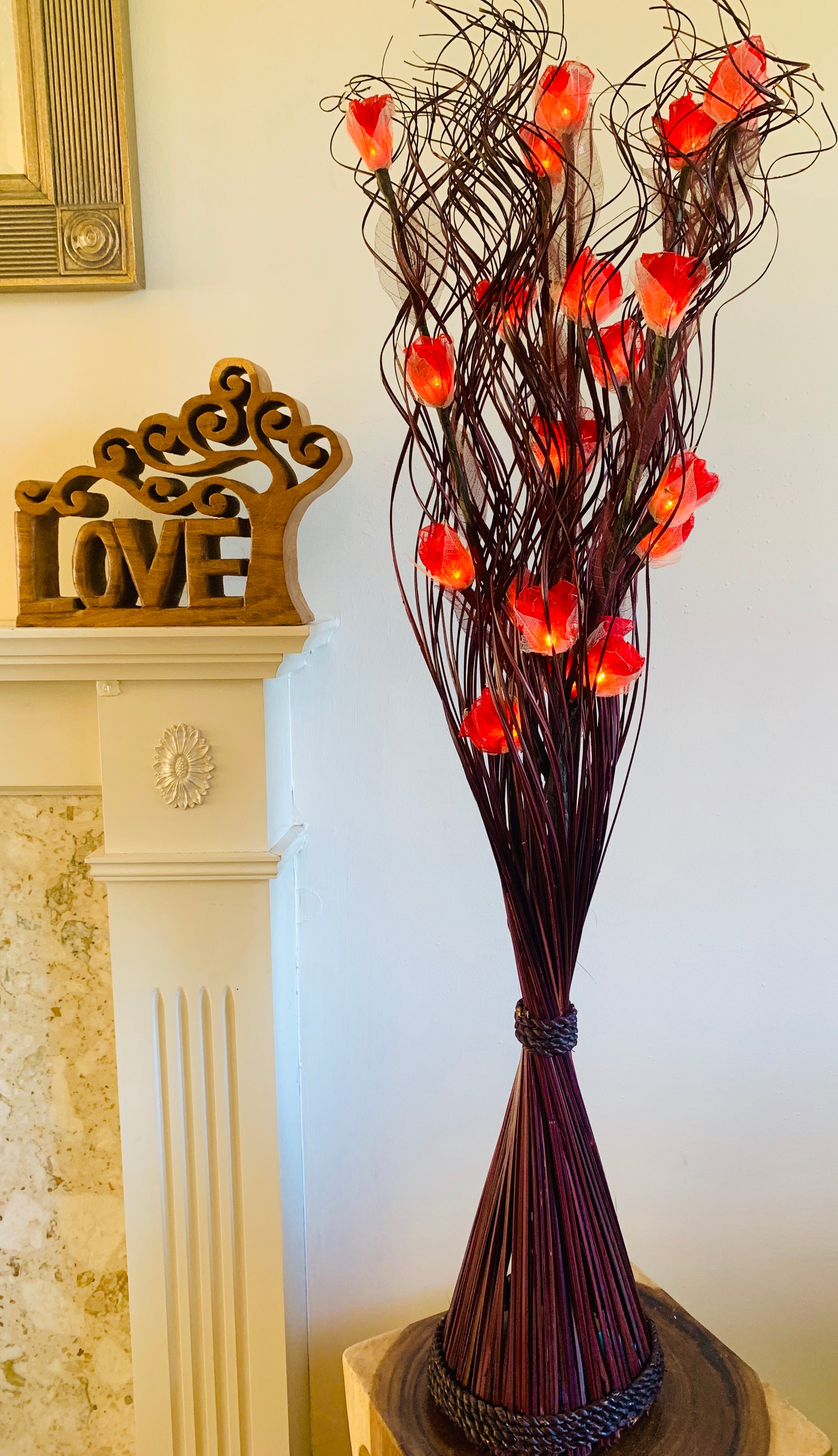 Our beautiful bouquet lights are handmade in Southern Thailand. These elegant floor standing lamps are both delicate and striking in appearance. The leaf lights nestle gently within the waves of the vase to create a warming natural glow. The production of these lamps is very labour intensive, which means that just a single purchase can help many different people. We work directly with a network of small groups and families, who are mainly women, and can work from home making these products. We have been working with many of these families since 2011 to ensure they have a safe working environment as well as a fair reliable wage.