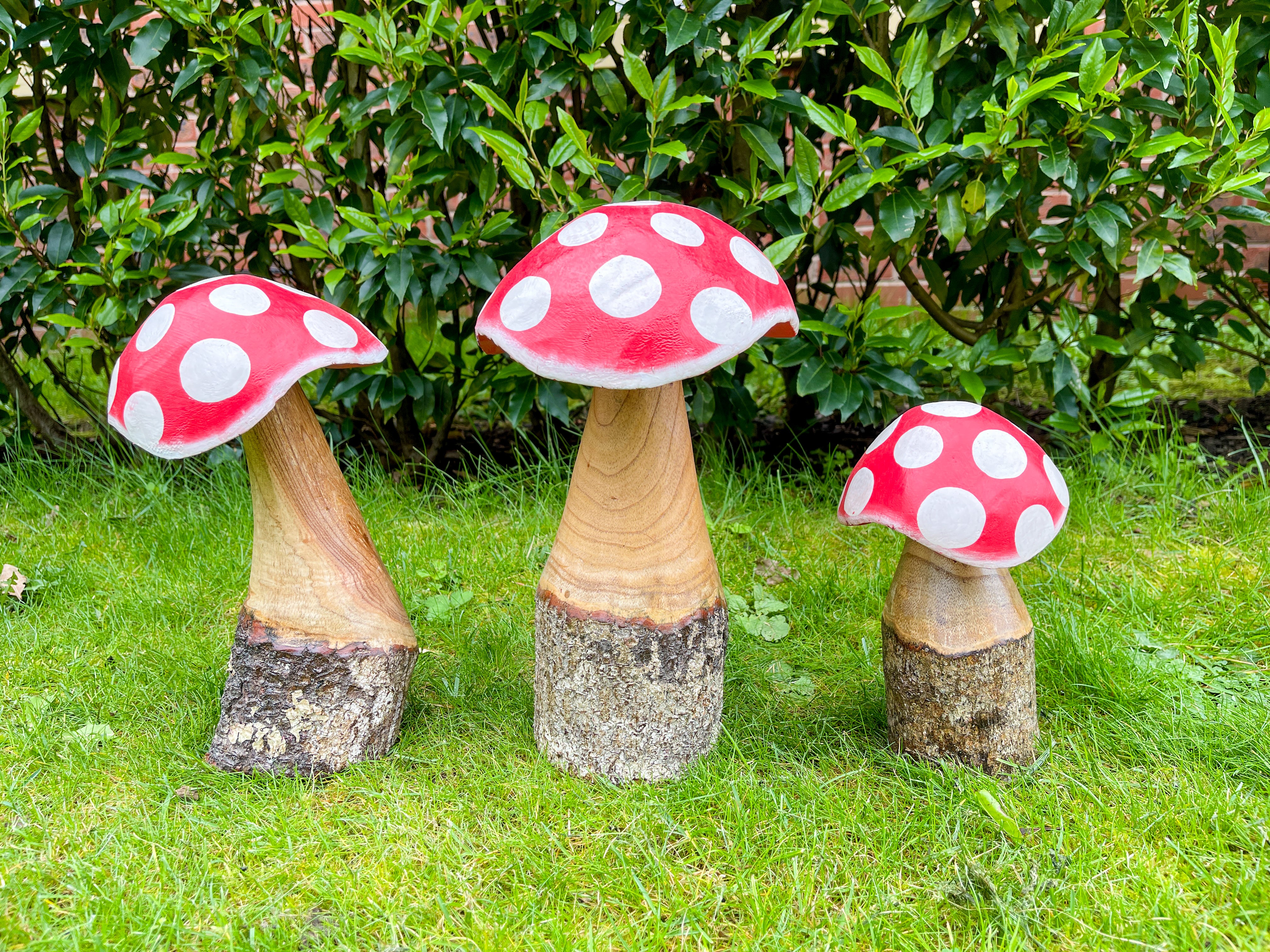 Add a whimsical touch to your garden with our set of 3 wooden log mushrooms. Handcrafted from real logs, these charming mushrooms will bring joy to any nature lover.
