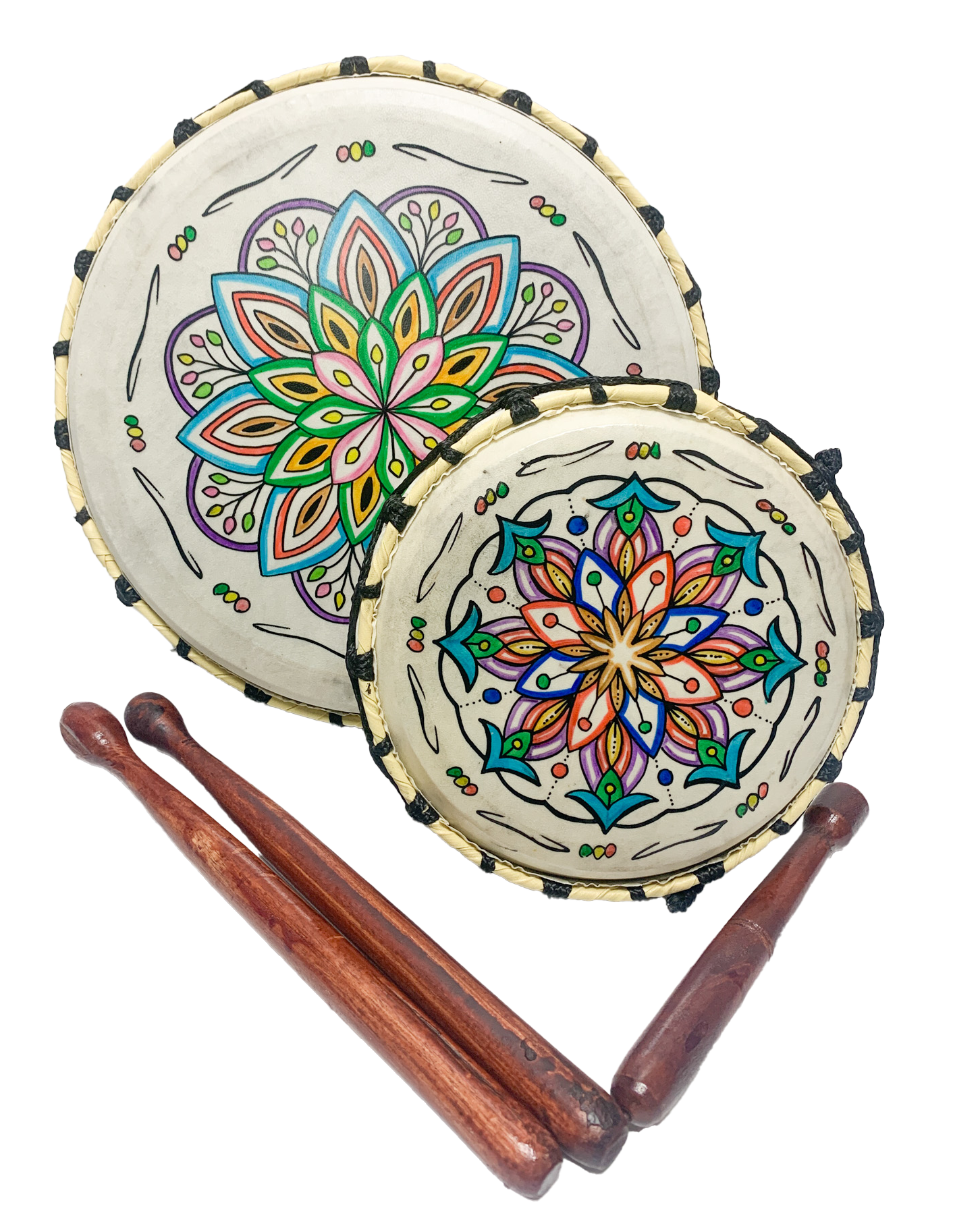 Our Shamanic Mandala Drums combine traditional craftsmanship with sacred design.. Each drum is handcrafted and features a hand-painted mandala — a powerful symbol of harmony and spiritual connection. As the designs are hand-painted each will vary slightly making each drum unique.