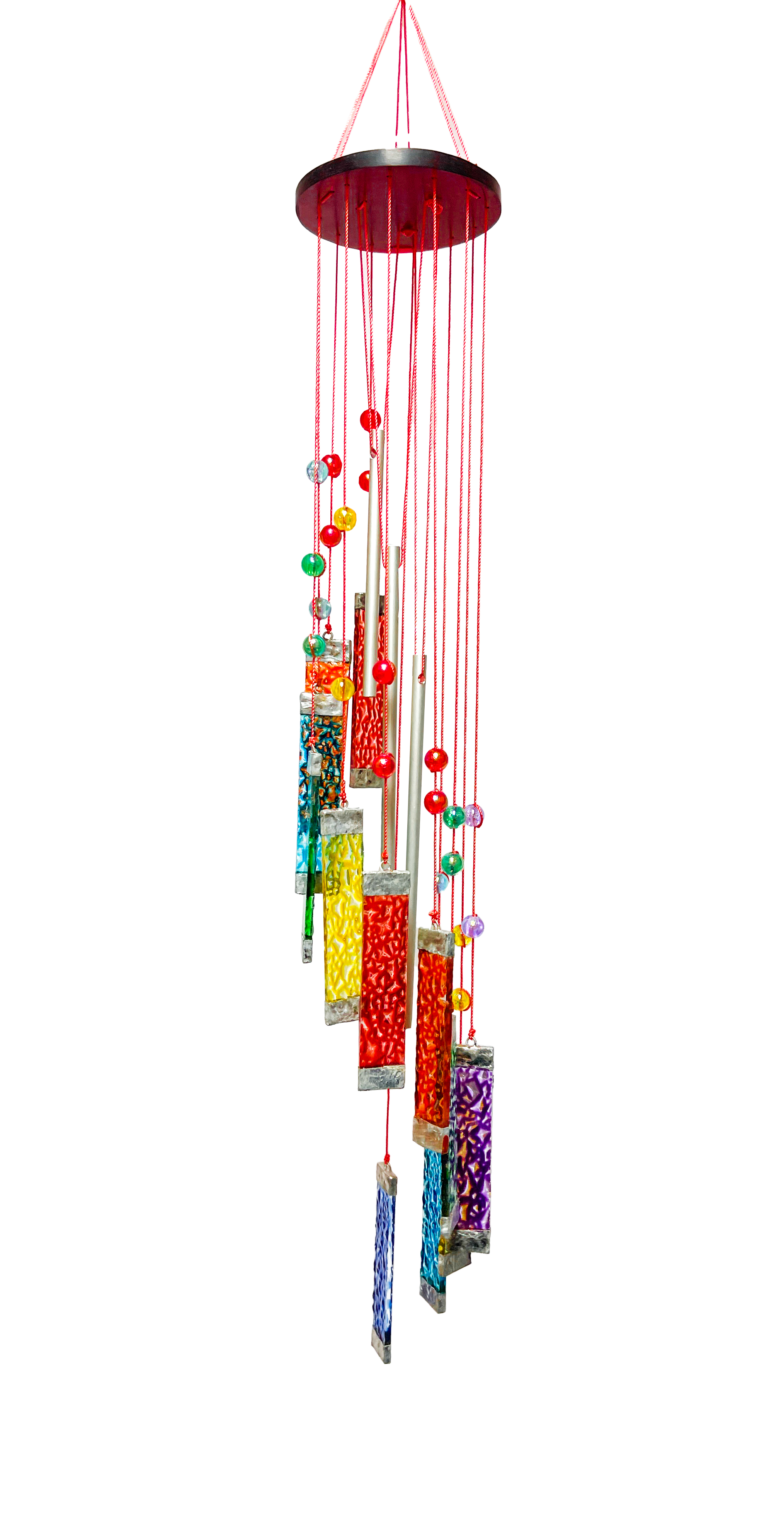 This beautiful glass wind chime consists of many pieces of coloured patterned glass hung together in a waterfall shape with 3 metal chimes in the centre. Guaranteed to brighten up any room!