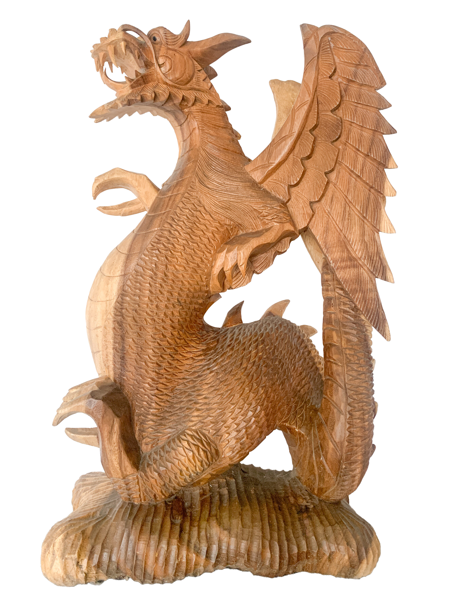 This hand-carved wooden dragon is a stunning representation of both nature and mythology. Made from Suar wood in Indonesia this dragon has been carved with incredible detail. The dragon's fierce face, with piercing eyes and sharp features, is truly captivating. From the individual scales on his body to his powerful wings this carving has a sense of power and mystic.
