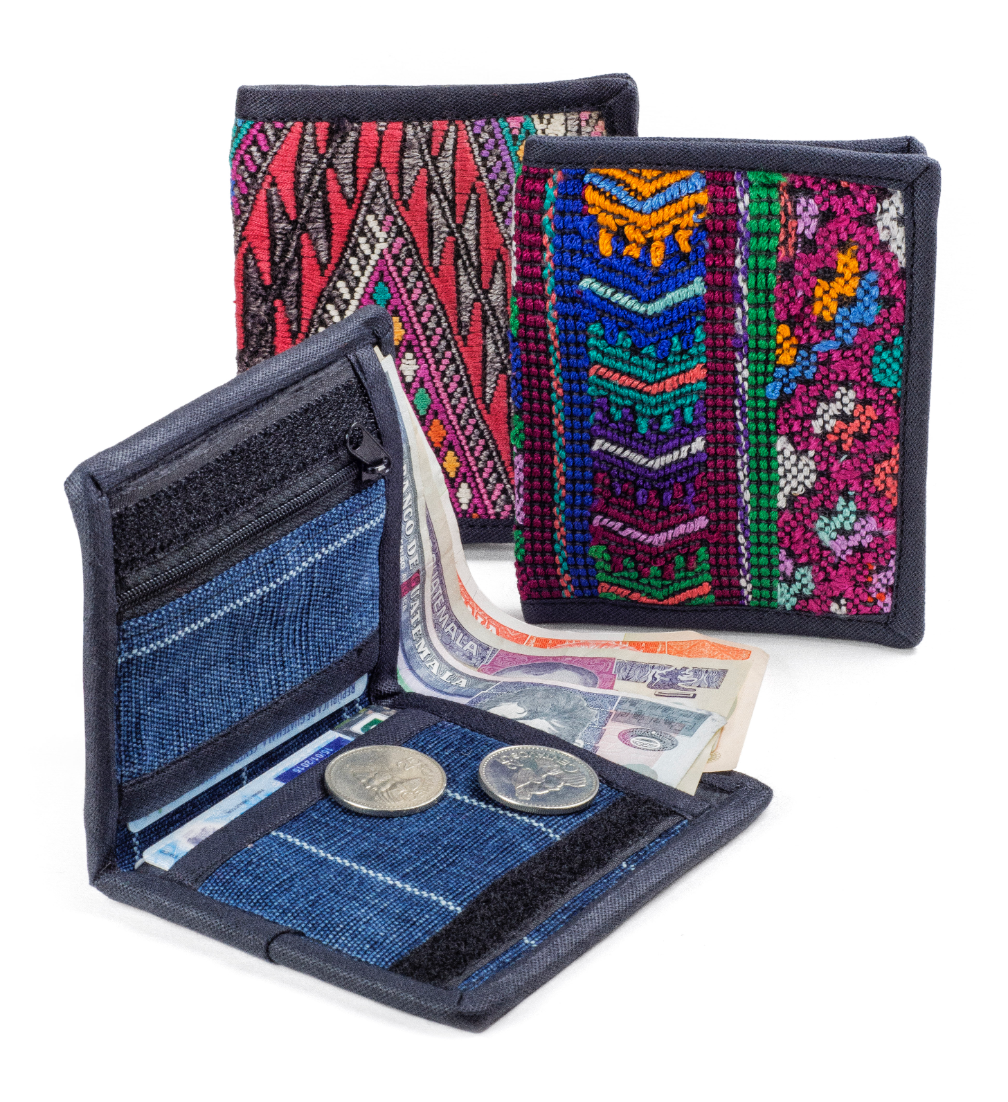 Each one of these wallets is stitched by hand and has a unique story in Guatemala, the Mayan descendants wear different patterns to show where they come from.